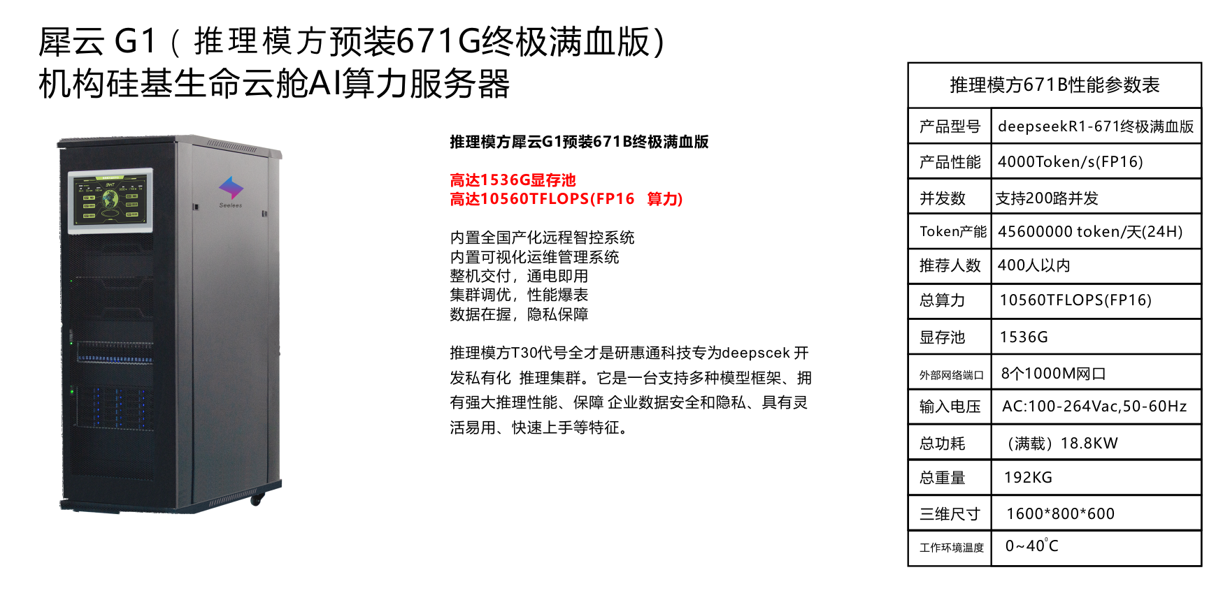 犀云G1,是驱动大型机构迈向“强人工智能”时代的核心引擎。它不仅为数万人的庞大社群提供创造“智能立传,硅基生命”的澎湃算力,更是旨在颠覆传统办公与数据处理模式的智慧中枢。 搭载您机构专属的私有化大模型,犀云G1将海量的数据录入与信息处理工作,提升至前所未有的自动化新高度,无论是复杂报表的智能生成、核心数据的深度挖掘,还是日常办公的智慧辅助,它都能游刃有余,极大提升决策与运营效率。 作为终极满血版,G1以集群“云舱”形态整合超万TFLOPS的巅峰算力。我们深知数据是机构的生命线,因此,犀云G1采用私有化部署与全栈国产化技术,从根本上杜绝了公有云的数据泄露风险。我们承诺“数据在握,隐私保障”,确保您机构的核心数据与知识产权安全无忧,让您在享受极致性能的同时,牢牢掌握数据主权。